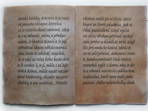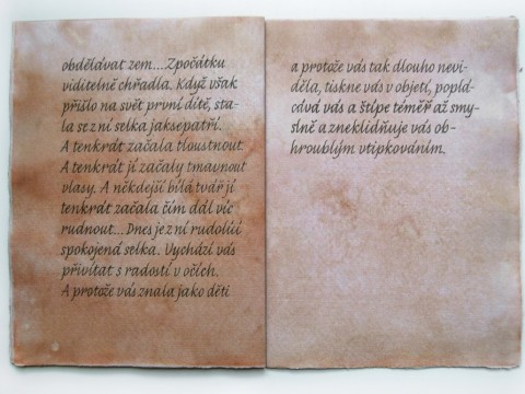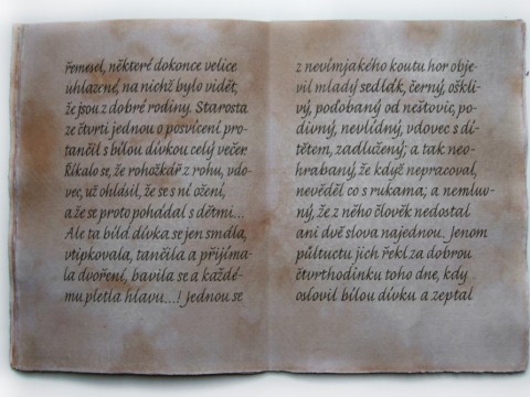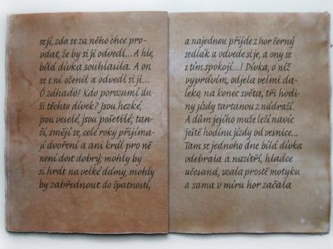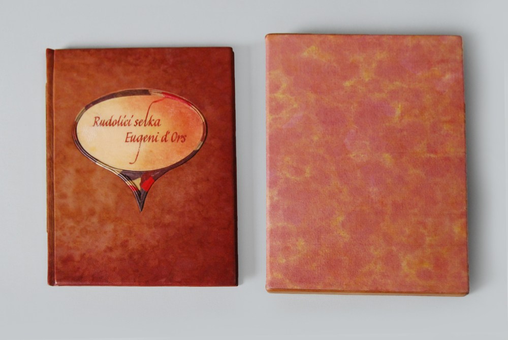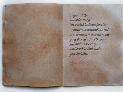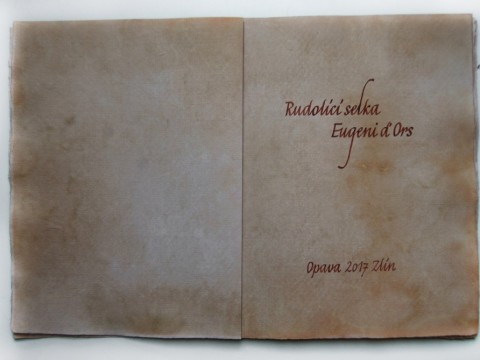 EUGENI D´ORS – RUDOLÍCÍ SELKA (autorská kniha), kaligrafie: Daniela Pavelková-Kubová, 2017. CKŽ, 208 x 155 x 12 mm, mořená skopovice, inkrustace, vellucent proces, patinování. Sestavované pouzdro, lihový papír. Vazba: květen 2017